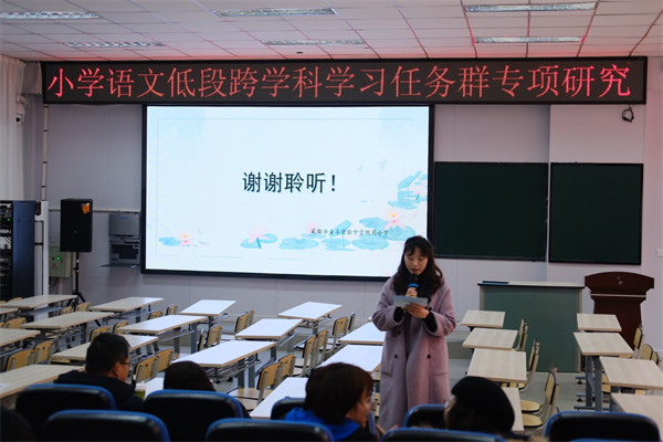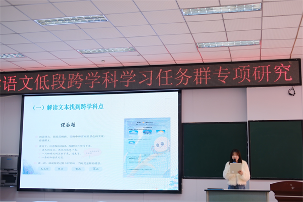专题汇报环节附小李靖菡老师则从校本实践出发,深入剖析了跨学科教学的时代意义、现实困境、实施原则与策略体系。陈虹宇老师对“单篇课文”到“单元整体”的系统化设计思路进行了分享,强调评价机制在保障学习质效中的重要作用。