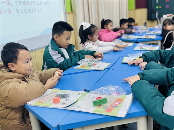 课中,刘慧欣老师以“三角形面包店面包丢失”为情境主线,设计趣味破案任务,迅速抓住学生的注意力。引导学生开展分、看、摸、滚等多感官实践操作活动,学生自主归纳图形特征并编制儿歌进行记忆,在活泼有序的课堂氛围中发展学生空间观念。