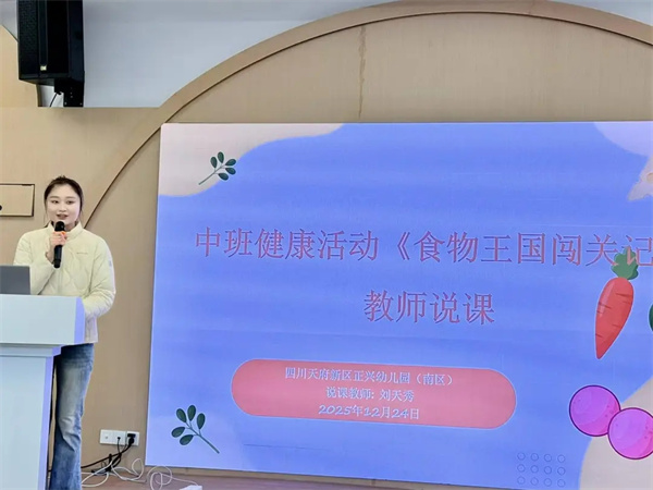 活动现场,正兴幼儿园(南区)刘天秀老师带来中班教学活动《食物王国闯关记》。本次活动以趣味闯关形式展开,带领幼儿走进食物王国。通过“认食材”“识营养”“配美食”等关卡,让幼儿在游戏中感知食物的营养价值,在搭配秘诀指引下为自己搭配出一份营养均衡的食物,萌发幼儿不挑食、爱吃蔬菜水果的好习惯。随后,刘天秀从活动目标、重难点以及活动组织过程和教学反思等方面进行了说课,为参会教师提供了可借鉴的教学实践范例。