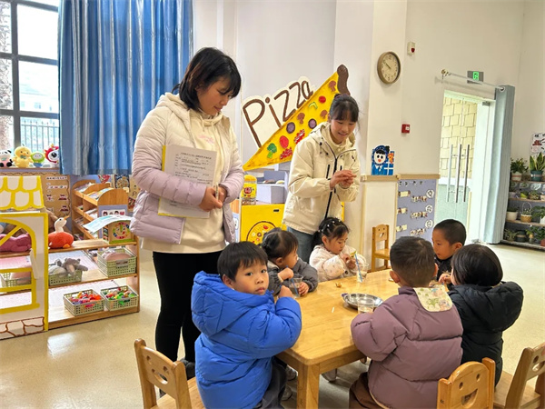 合江幼儿园教研组长陈腊梅、陈玥、倪张红,分别走进小、中、大班开展蹲点指导。全程观摩角色游戏、区角游戏、集体教学、户外体育及生活环节,一边细致记录活动亮点,一边针对环节组织中的细节问题进行现场指导。
