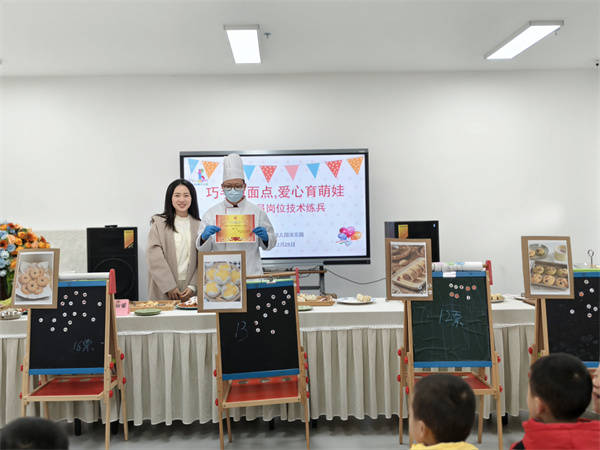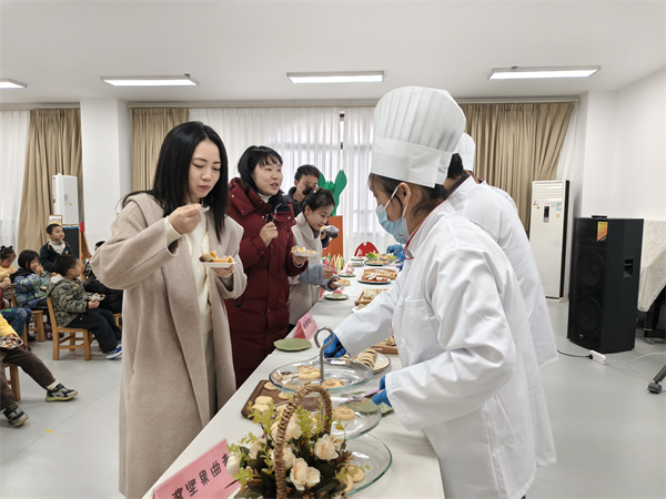 活动现场,食堂工作人员依次登台,带来蓝莓瑞士卷、滋味甜甜圈、南瓜开花包、金豆打滚儿、坚果曲奇饼干等创意面点。制作者们详细分享了食材搭配、工艺细节与营养考量,展现出扎实的专业功底。她认真聆听每位制作者对食材搭配、工艺细节、营养考量的讲解,不时点头赞许,随后参与投票环节,为心仪作品投上宝贵一票,并为获得一等奖的厨房工作人员颁奖。
