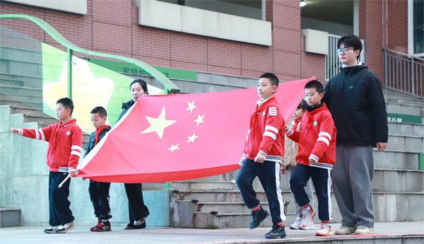 伴随着庄严的国歌,五星红旗冉冉升起、迎风飘扬。师生齐声高唱,以庄重仪式厚植爱国情怀,展现了师生昂扬向上的精神风貌。