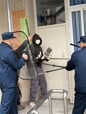 演练模拟一名暴恐分子翻入校园,企图伤害师生的突发场景。校门口异常情况出现后,安保人员第一时间驱离未果,暴恐分子翻墙触发“边界报警器”,安保人员随即通过智慧安防系统上报并启动应急预案。校长接到汇报后,迅速协调校园护卫队持械拦截,同时通过广播指令各班师生紧闭门窗、返回教室避险。应急防暴小组使用钢叉、警棍等器械与暴恐分子周旋,最终在警方支援下成功将其控制。