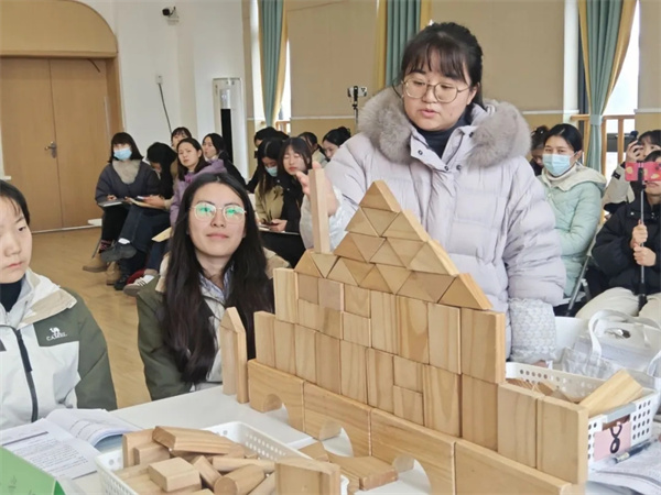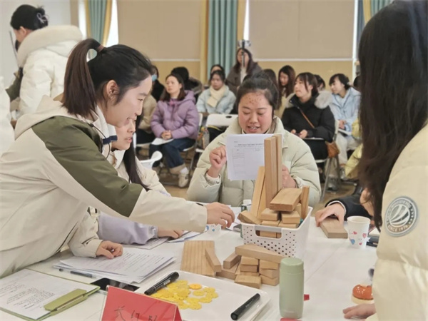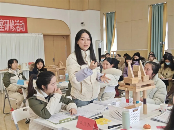 理论浸润之后,李婕老师带领全体参会教师,开展了以《基于观察分析促进幼儿几何与空间能力发展的支持行为研讨》为主题的互动式教研。
