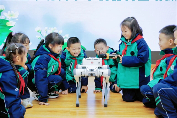 在谢主任的带领下,机器狗迈着欢快的步伐走进班级,瞬间点燃了同学们的热情!