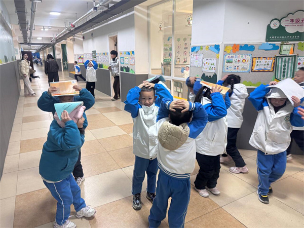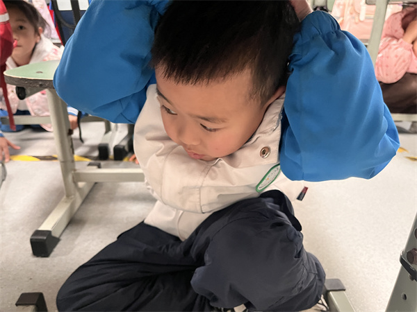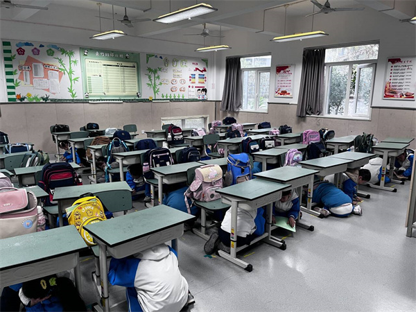 上午9:32,随着校园广播中“地震预警信号”的响起,本次防震演练正式拉开帷幕。正在教室开展教学活动的老师们迅速反应,立即组织学生执行“就近避险”指令:学生们双手抱头,弯腰屈膝,快速躲到课桌下方,将身体蜷缩成“安全姿势”,并双手护住头部和颈部,避免头部受到撞击,整个避险过程紧张有序,仅用1分钟便完成全员避险就位。
