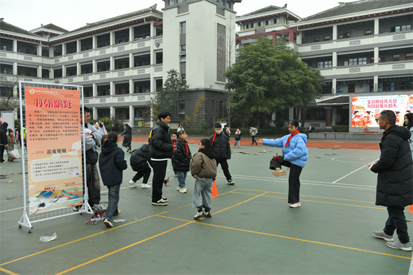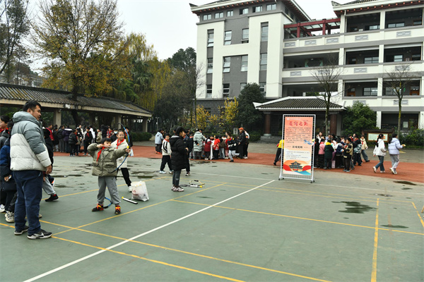 与热闹市集相映成趣的,是环绕操场跑道的传统游戏游园区。此处以古代“君子币”作为通行凭证,设立了五项蕴含中华智慧与体育精神的传统游戏项目,引导学生在玩耍中触摸历史脉络。