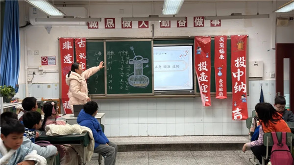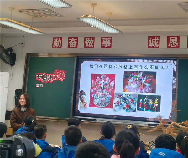 四节非遗公开课精彩纷呈:段钰铭老师执教《品梁山好汉,绘水浒风云》,融合语文阅读、美术创作与戏曲体验;文婷老师带领学生《投壶明礼,修身致和》,在课堂中融入体育活动、数学测量与传统礼仪;唐小岚老师的《面塑送吉祥》结合美术造型与材料科学跨学科课以及刘颖老师带来的低段《巧做花点心》手工实践课都让孩子们沉浸式体验到“非遗进课堂、课堂有非遗”独特魅力与快乐。