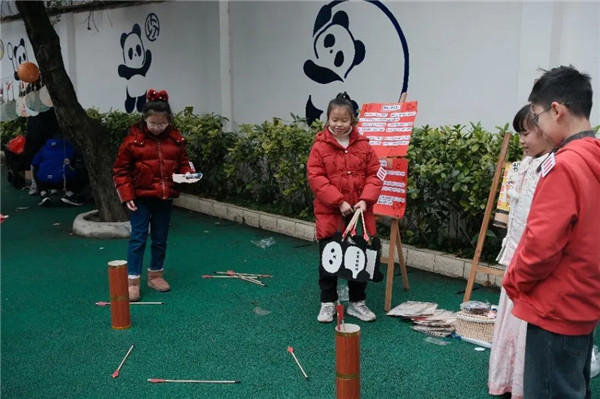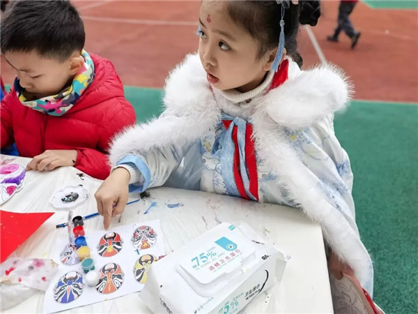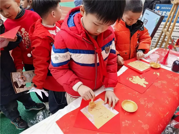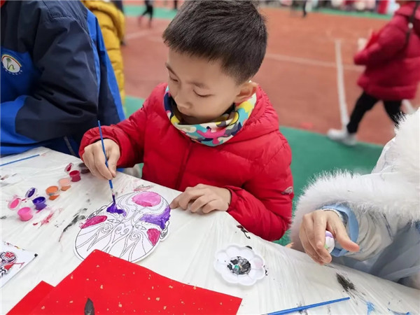 本次活动采用“教室深耕+操场联动”的双轨体验模式。各年级首先在教室开展主题非遗活动:一年级巧手捏面塑、二年级墨韵拓古纹、三年级皮影演故事、四年级剪纸生百花、五年级投壶习古礼、六年级彩绘绘脸谱,实现“一班一品、一级一题”。室内活动与大操场内“非遗集市”同时开始。学生分时段有序进入大操场参与“非遗互动集市”各类非遗摊位体验。各年级非遗主题体验点位,以及自愿报名的漆扇、编绳、纸鸢、书法小小摊主点位共同组成十余个体验点位,各类非遗内容丰富、各具特色,现场气氛热烈、互动频频,一种通过非遗活动穿越时空的感觉油然而生。