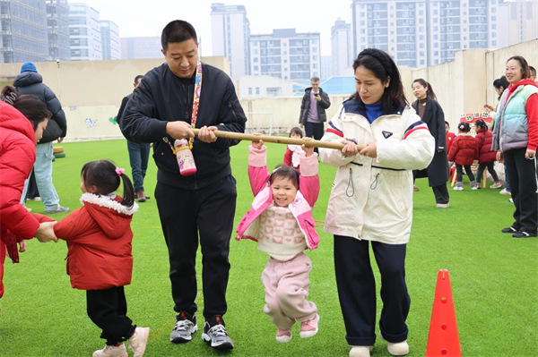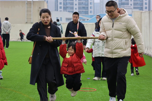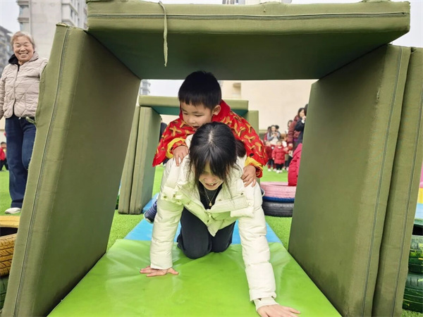 运动场瞬间化身为奇幻的西游乐园。只见家长们或俯身成为等待翻越的“五指山”,或紧密配合搭建起通往终点的“流沙河浮桥”。孩子们则化身勇敢的小悟空、机灵的小八戒,在家长的守护与协助下,奋力闯关。欢笑声、加油声、成功的欢呼声此起彼伏,每一个角落都洋溢着浓浓的亲子温情与协作的快乐。