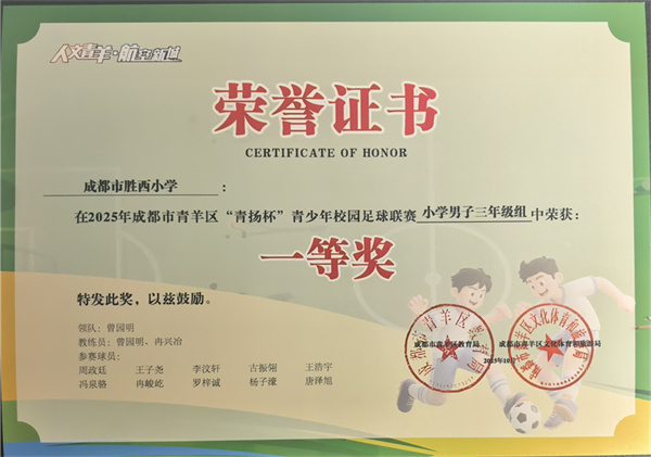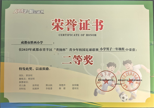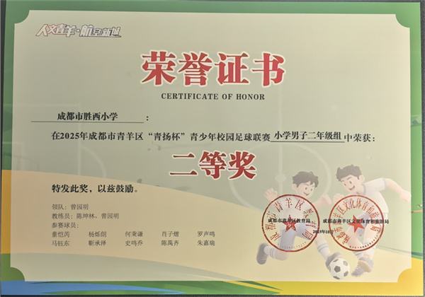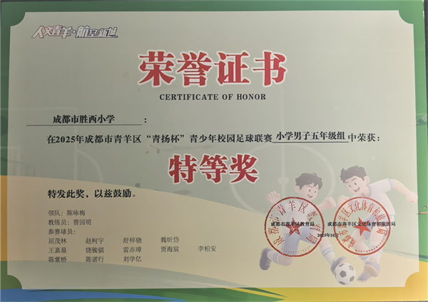 2025年成都市校园足球“T乙”联赛与青羊区“青扬杯”校园足球联赛于12月末落幕。成都市胜西小学1-5年级足球校队双线出征,在为期两个月的高强度赛程中奋勇拼搏,斩获市、区级多项荣誉,尽显校园足球风采!