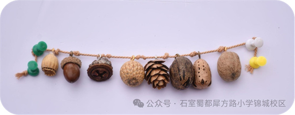 “我用橡果做吊坠,用栾树种子做串珠”五年级的李同学向同伴展示自己的作品。在这里,自然材料不再是冰冷的研究对象,而是承载情感与想象的艺术媒介。孩子们在创作过程中,不仅体验了自然之美,更理解了自然与人文艺术之间千丝万缕的联系。