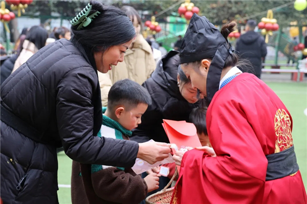 演出落幕,“唐风十锦坊”市集在操场上鲜活铺展。十项游艺,传承古今于亲子协作,孩子们手持“通关文牒”,与父母共赴一场沉浸式唐风体验。
