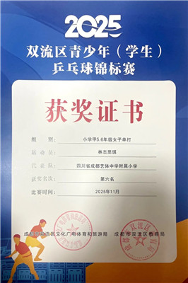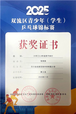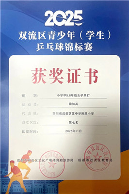 此次参赛不仅为学子们提供了切磋球技、展示自我的平台,更培养了大家坚韧不拔的意志品质和团队协作精神。学校将以此次赛事为契机,持续重视体育教育,深耕乒乓球等特色体育项目,鼓励更多学子参与体育运动,助力儿童全面发展。未来,学校将继续积极参与各类区级体育赛事,争取再创佳绩!(江蕾 通讯员 唐兴兰)