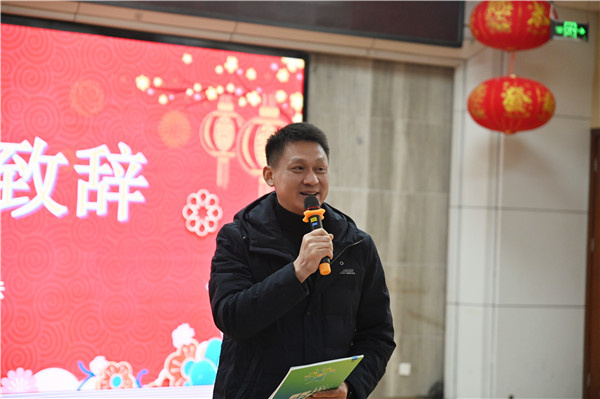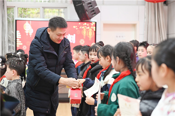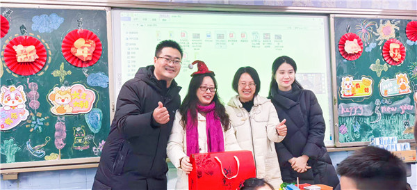 班级联欢结束后,校级庆祝环节拉开了序幕。校长李忠云首先代表学校向全体师生致以新年的祝福与诚挚的问候,回顾了过去一学年学校各项工作取得的丰硕成果,肯定了全校师生们的辛勤付出与亮眼成绩。致辞后,学校三位校长带着寓意“学业进步、喜乐常伴”的新年福袋,走进每个班级,亲手将礼物送到同学们手中,叮嘱大家在新的一年里保持好奇、勤学善思,让温暖与期许传递到校园的每个角落。同时,校长寄语全体师生在新的一年里心怀梦想、奋勇拼搏,以更饱满的热情和更昂扬的姿态迎接新挑战、书写新篇章。
