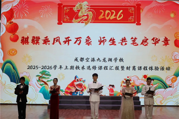 岁序更迭,华章日新。当新年的脚步声临近,成都空港九龙湖学校以一场别开生面的元旦迎新活动,奏响了2025-2026学年秋季学期的华彩终章。12月31日,“骐骥乘风开万象 师生共笔启华章”校本选修课程汇报暨财商课程体验活动在校园内盛大举行。双流中学教育集团及周边兄弟学校、双流区关工委、航都派出所、九龙湖社区等多方领导、学生家长与全体师生齐聚一堂,共同见证这场融文化传承、课程展示、家校社联动于一体的教育盛宴。