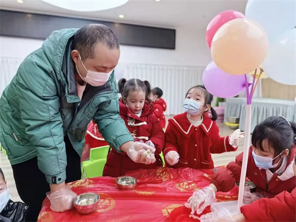 活动的第二天,幼儿园变成了美食的天地。孩子们在老师和家长志愿者的指导下,一起搓汤圆、包春卷、制作水果糖葫芦,品尝各地新年特色小吃,大家围坐一起,共享温馨的“团圆九大碗”午餐。