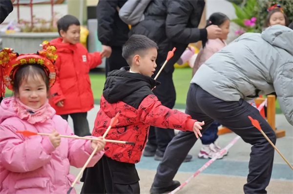 老师们精心布置了集米处、打卡点与舞台,准备了松果、树叶等自然材料,摆放了投壶、灯谜等传统游戏道具。师幼均身着红色节日服装,幼儿园里处处洋溢着喜庆与期待。