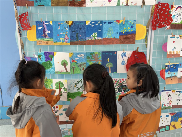 在金沙小学D区“时间的故事”美术画展现场,孩子们用画笔与创意编织出独属于自己的时间童话。展厅里,拼贴的四季画卷勾勒出春生夏长、秋收冬藏的时光轨迹,红彤彤的剪纸窗花晕染着节日的时间氛围,还有充满童趣的生肖马绘、五彩的指纹拓印长卷,将抽象的时间化作可触可感的色彩与线条。