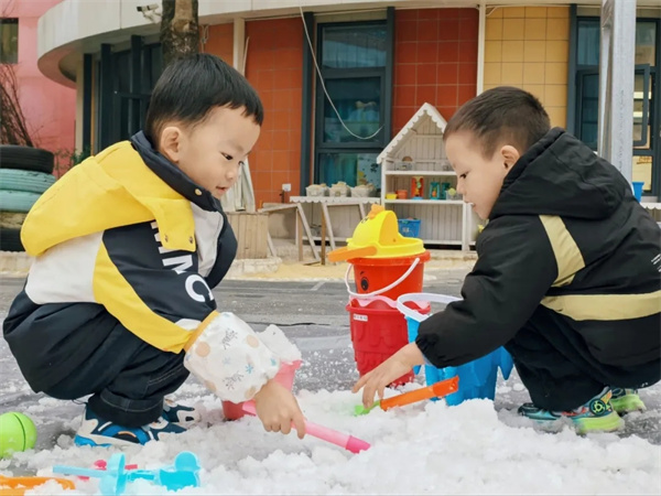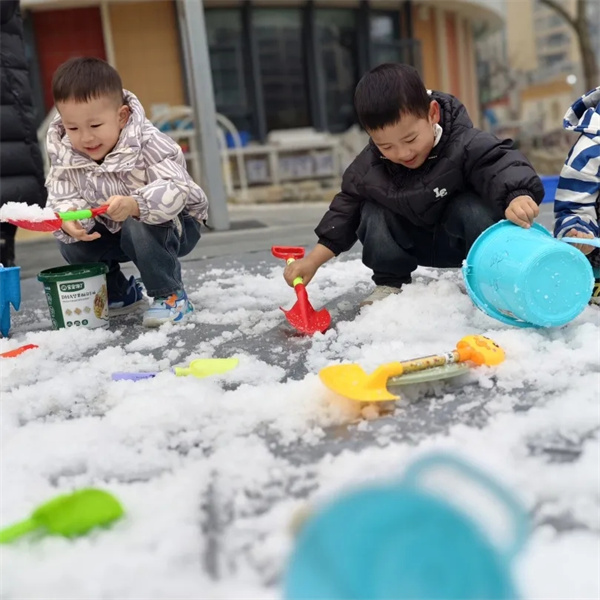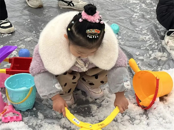 滚动的是“雪”球,锻炼的是协调;涂抹的是色彩,绽放的是想象。雪粉、小铲、模具等齐登场!孩子们化身冬日设计师,和小伙伴合作堆小雪人、捏雪造型:有的用工具挖制各种形状;有的直接用手在“雪”上涂鸦,描绘心中的冬天……每一个孩子,都是雪地里最专注的“小小创作家”。