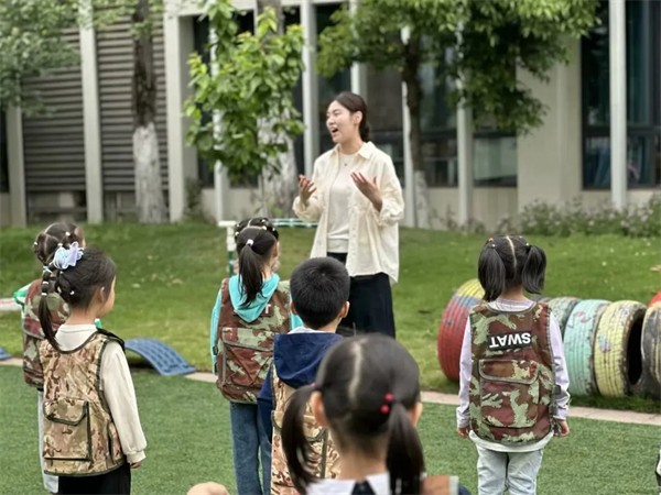 虎燕灵老师带领新教师观摩园所环境,从充满创意的班级特色活动区域到绿意盎然的户外自然空间,均体现园所“美好”文化。