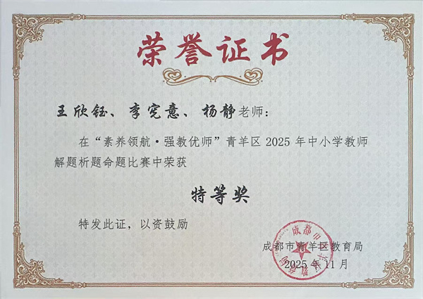 近日,由青羊区教育局、青羊区教育科学研究院主办的2025年中小学教师解题析题命题大赛圆满落幕。经过激烈角逐,成都市胜西小学数学教研组杨静、李宪意、王欣钰三位老师凭借扎实的学科功底、严谨的教学思维与出色的临场发挥,从全区众多优秀教师中脱颖而出,荣获大赛最高奖项——特等奖。这一荣誉不仅彰显了学校教师卓越的专业素养,更是学校教研实力与团队协作精神的有力体现。