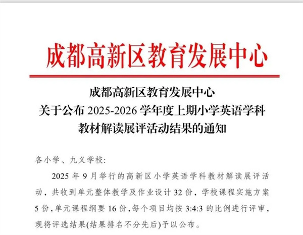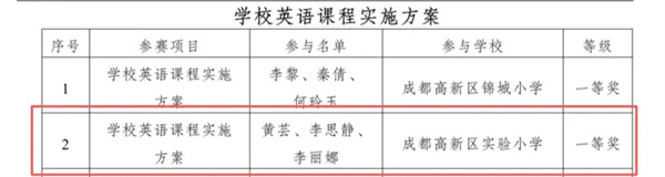 近日,成都高新区实验小学英语组黄芸、李思静、李丽娜三位老师在“2025-2026学年度上期成都高新区小学英语学科教材解读展评活动”中,凭借精心打磨的英语课程实施方案,脱颖而出,荣获一等奖!