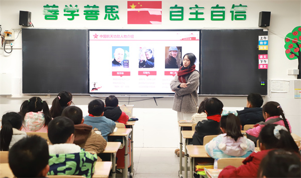 随后,主题宣讲环节中,两位小主持人用童趣十足的语言,带领同学们开启生活中的科技奥秘之旅,细数中国科技的亮眼成就:“蛟龙”“奋斗者”深潜大洋,“长征”“天问”遨游苍穹,“嫦娥”探月,“祝融”探火,“天和”空间站驻留太空,华为5G,中国天眼跻身世界前列……一个个鲜活的案例让同学们发出由衷惊叹。在科技榜样介绍环节,小主持人用浅显易懂的话语讲述着科学家们的坚守与奉献,向“科技英雄”致以崇高的敬意。“少年强则国强”,师生们共同喊出“科技创新,强国有我”的口号,将现场氛围推向高潮。
