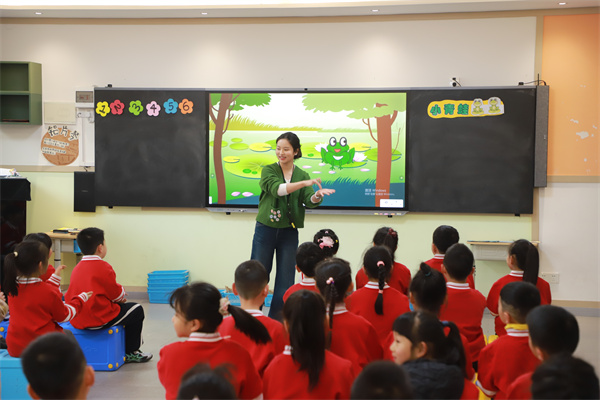 9:15,音乐教师吴晓玮与一年级二班孩子们一起带来《小青蛙》课堂展示。课堂上,吴晓玮以趣味谜语导入,紧扣“自然与生命”主题,通过聆听辨析、声势律动、角色扮演等活动,引导一年级学生感知乐曲“ABA”曲式结构,跟随音乐的强弱、快慢变化演绎“青蛙跳跃、游泳、抵御暴风雨”等场景。同时,课堂融入二胡乐器知识教学,让学生在沉浸式体验中感受民族乐器的魅力,培养审美感知与艺术实践能力,充分展现低年级音乐教学中“游戏化、情境化”的鲜明特色。