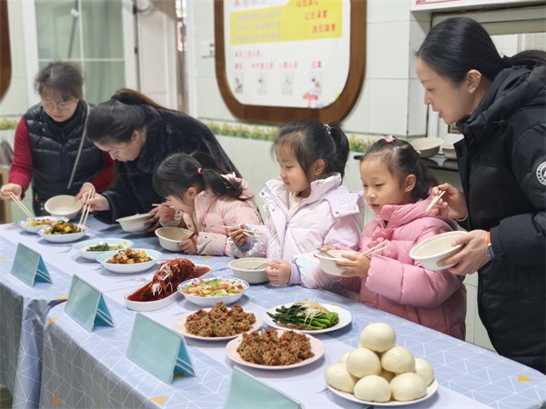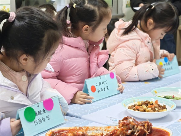 食堂练兵现场香气四溢,厨师们精心打造咖喱鸡、芝士肉松包等兼具营养与创意的菜品,三位幼儿小评委用童真味蕾品鉴打分,受欢迎的菜品将纳入后期推广菜单,让幼儿餐食更合心意。