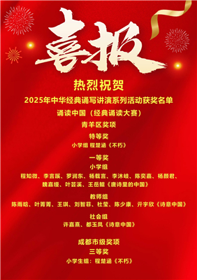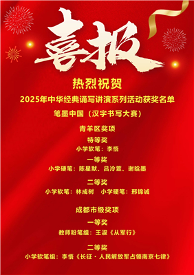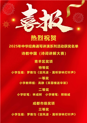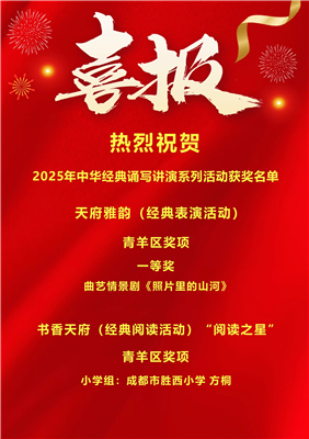 中华经典如星汉璀璨,照亮成长之路;文化传承似春雨润物,滋养少年心田。近期,成都市、青羊区2025年中华经典诵写讲演系列活动获奖名单相继揭晓,成都市胜西小学师生以文为媒、以艺为桥,在诵、写、讲、演的舞台上绽放光彩,揽获多项市、区荣誉,用实力诠释了传统文化的当代魅力。