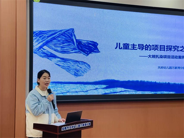 回到二楼会议室,两场专业案例分享接踵而至。大一班教师李燕以《儿童主导的项目探究之旅》为题,分享扎染项目实践,从儿童兴趣出发,围绕分组分工、问题甄别、亲子共探及教师精准支持等环节,生动呈现幼儿主动探究、大胆尝试的实践亮点;冉茂红老师带来《叶子博物馆》案例分享,聚焦叶脉书签定制、穗子制作、书签售卖等真实任务,展现幼儿在自主探究中提升解决问题能力的完整过程,为参训教师提供了可借鉴、可落地的特色课程实施范式。分享过程中,老师们专注聆听、认真记录,细致梳理课程实施的实操亮点与创新思路。