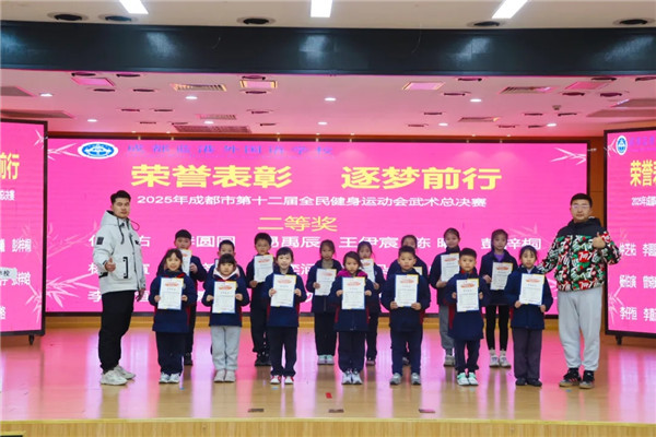 在线下市级赛事中,成都蓝港外国语学校学子同样不负众望。在“运动成都”成都市第十二届全民健身运动会武术总决赛暨2025年成都市全民健身八段锦推广活动总决赛上,杨炀馨语,罗文浩宇,张文馨等8名同学组成的团队荣获学校组集体八段锦二等奖;另有张小写、陆雨彤、李雅萱等27位学子在该赛事的小学组武术集体项目中斩获二等奖,用实力为学校争光。
