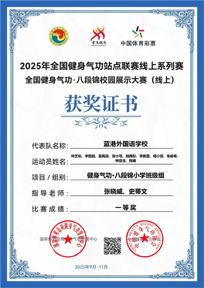 近日,在2025年全国健身气功站点联赛线上系列赛之全国健身气功八段锦校园展示大赛中,成都蓝港外国语学校刘姝灵、尹马吉娜、邓雨彤等17名同学组成的代表队以及仲芝佑、李圆园、易禹辰等10名同学组成的代表队,在全国众多参赛队伍中脱颖而出,均荣获小学班级组一等奖。