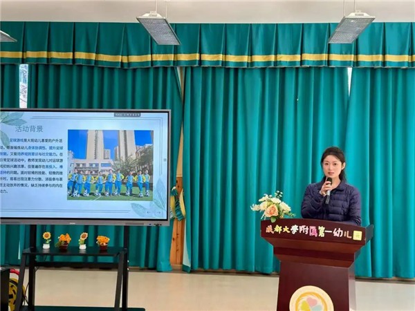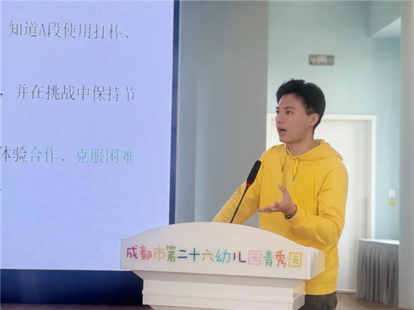 实景观摩后,干货满满的解析分享接踵而至。曾美老师围绕《动物足球会》课例,从身体激活、技能掌握等四个环节拆解设计思路与实施细节。园点负责人李芸园长以《同育悦美之花 共谱筑梦乐章》为题,分享集团发展历程与办园理念。刘诗琪、高川梅等四位老师分别聚焦竹竿游戏、足球活动等,带来实践经验与教育思考。