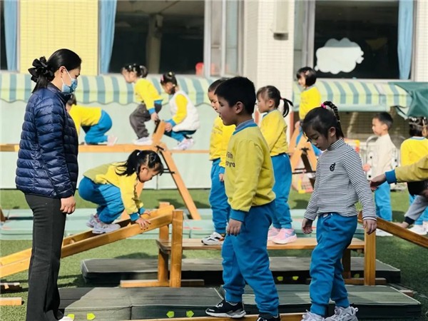 签到伊始,培训班老师们便踏入一楼操场,沉浸式观摩了园区特色环境创设与班级创造性游戏。孩子们在生活化场景中自由探索、快乐互动,“悦美”教育氛围扑面而来,让老师们直观感受环境的教育载体魅力与园所教学实践细节。