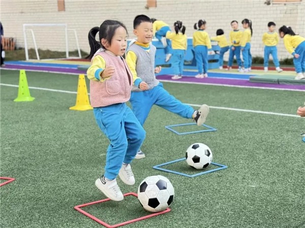 活力晨间,培训班老师们首先观摩大班的早操活动,孩子们手持彩绳玩转花样绳操,蓬勃朝气感染全场;随后,陆露老师带来大班足球活动《动物足球会》,以趣味情境激活幼儿下肢肌肉,在团队赛中让孩子们掌握控球技巧,锤炼毅力与团队协作力。培训班老师们还漫步园区,感受“以儿童为本”的环境创设理念,足球主题墙面、文化展示角等特色布置,让大家直观领略环境的教育价值与浓厚的足球游戏氛围。
