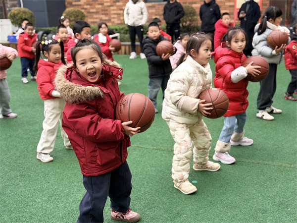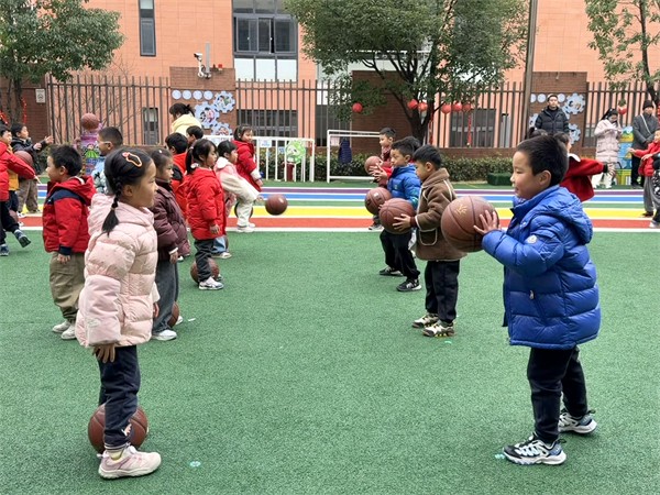 小小篮球在手中灵活跳跃,拍球、运球一气呵成,孩子们精神抖擞、活力全开,用利落的动作展现运动风采,在挑战中突破自我,每一个瞬间都洋溢着勇敢与自信,尽显大班萌娃的运动魅力!