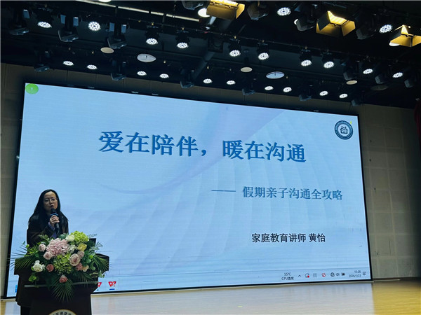 随后的家庭教育指导讲座将会议推向高潮。学校特邀国家二级心理咨询师、家庭教育讲师黄怡以“爱在陪伴 暖在沟通”为主题作假期亲子沟通专题讲座。黄怡从亲子沟通难题讲起,围绕作息、电子产品使用、学习动力、情绪引导等话题,通过情景分析、互动问答、策略讲解等方式,给出实用温暖的家庭教育建议。她强调“感觉好才能做得好”,倡导家长正面引导,构建和谐亲子关系,助力学生充实度过假期。