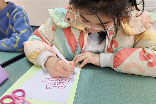 孩子们化身“小小非遗传承人”,左手扶纸,右手运剪,折、剪、刻、贴,每一步都专注而用心。有的反复调整剪刀角度,让“勤”字笔画刚劲有力;有的精心镂刻金鱼鳞片,追求灵动细节;还有的巧妙拼合各色卡纸,使文字与纹样层次分明。当一幅幅融入“勤俭持家”“家和万事兴”等主题的作品逐渐呈现,孩子们的脸上也浮现出自豪的笑容。