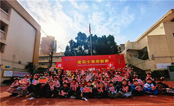 完成所有关卡后,孩子们带着满满的通关印章,前往旗台广告背景墙打卡留影,手持闯关卡与体育道具定格欢乐瞬间,班级集体合影更是记录下这份专属的新春成长记忆。