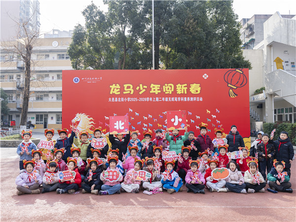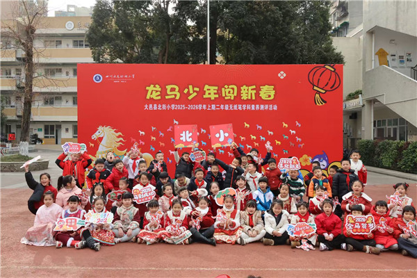 为深入贯彻落实教育部办公厅关于教育评价改革和“双减”工作要求,立足情趣教育理念,紧扣学科核心素养,2026年1月27日,大邑县北街小学开展了一场以“龙马少年闯新春”为主题的无纸化综合素质测评活动。活动以趣味闯关形式融合多学科知识,让孩子们在玩中学、乐中测,在浓郁年味里展现风采、提升素养。