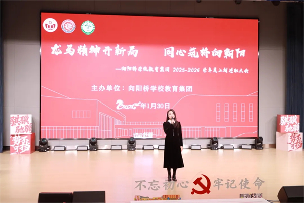 2026年1月30日上午,向阳桥学校教育集团在向阳桥小学B区报告厅召开2025-2026学年度上期期末述职大会。向阳桥小学、向阳桥中学、大面中学全体教职员工齐聚一堂,共同回顾学期历程,总结工作成果,展望未来发展。大会以“龙马精神开新局 同心筑桥向朝阳”为主题,彰显集团全体教育工作者同心同德、奋发向前的精神风貌。