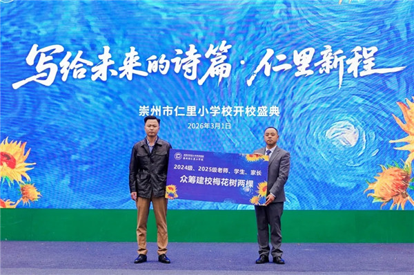 成都隆腾投资集团捐建“仁里书院”,让书香在此间流淌;崇庆街道仁里社区与学校共建“放翁诗社”,让诗意于童年生根;成都蜀王府餐饮管理有限公司捐赠图书3500册,以书籍点亮童心,学生代表陈楷沐与马志共同上台接受这份爱心;2024、2025级师生、家长共筹两株建校梅花树,由家委会主任祝润代表全体师生及家长捐赠。