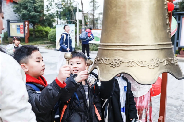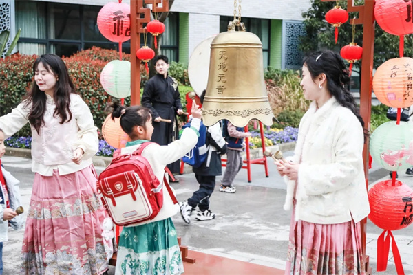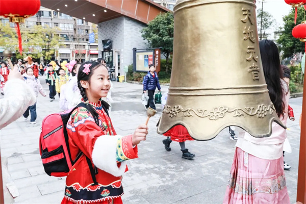 春风送暖启新程,校园处处焕生机。元音钟成了孩子们的“心头好”,清脆声响此起彼伏,交织成校园里最动听的春日序曲。“击鼓明志”环节热闹非凡,“小元宝”们排着整齐队伍,紧握鼓槌奋力敲击,鼓声铿锵有力,既敲响新学期的期盼,也寄托对未来的美好憧憬,在庄重又有趣的仪式中,开启新学期全新征程。