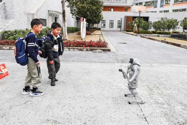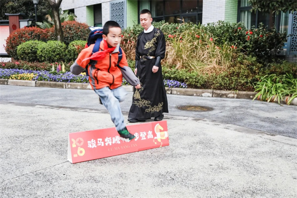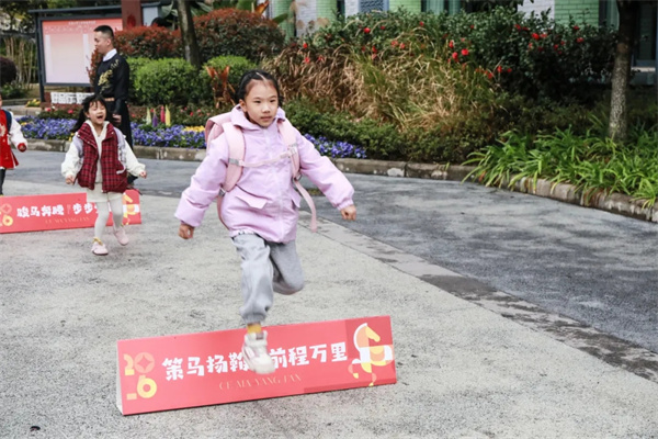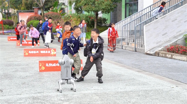 大音路上,跨栏互动区成为打卡热门地点。“马踏春风,锦绣未来”,孩子们一个个奋力跨越,在欢声笑语中感受着新学期的美好寓意。大音路转角处,灵动的机器狗闪亮登场,酷炫的动作展现着未来科技的新力量,引得孩子们纷纷驻足观看、欢呼喝彩,为报到现场增添了别样的科技乐趣。