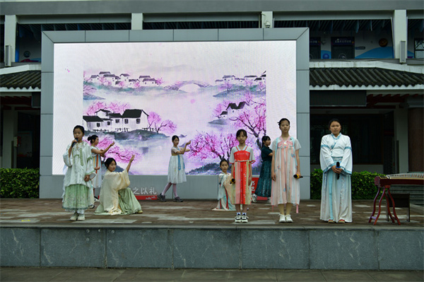 六年级的学长学姐们以成长献礼,带来了精彩的节目展演,成为开学典礼上一抹亮眼的风景。《七色光之歌》唱出童年的温暖明亮,《大鱼》《心动》演绎成长的温柔与力量,《少年立志》抒发少年的远大抱负,《苔》传递平凡亦要向阳绽放的信念。一个个精彩的节目,不仅展现了文翁少年的风采,更以行动诠释了“少年读书时,芳华自绽放”的真谛,为学弟学妹们树立了榜样。