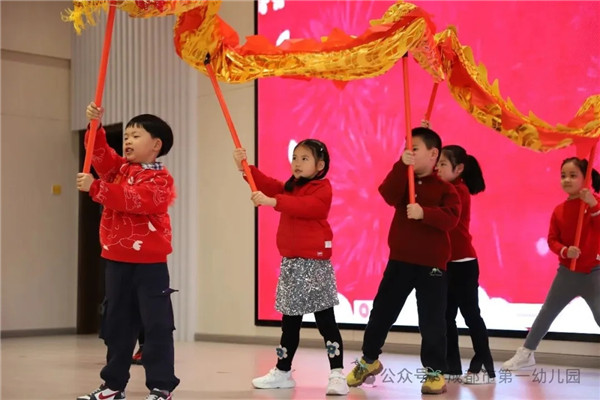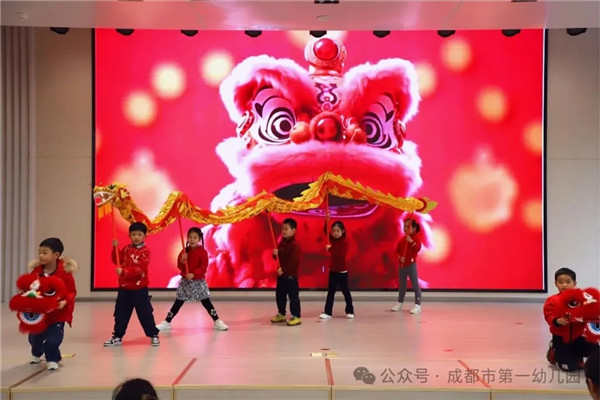 大班的孩子们化身小小传承人,为大家献上民俗表演《舞龙醒狮闹元宵》。