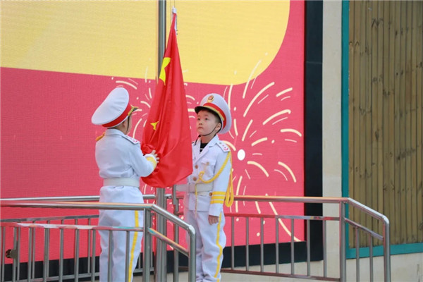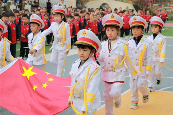 升旗仪式准时开始。国歌响起,孩子们站得笔直,目光追着红旗,一直升到了“蓝天里”。