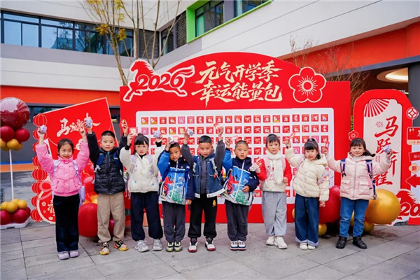 校园里,“马上进步能量站”前排起小队。红彤彤的架子上摆满了“能量包”:小马布偶、马年盲盒、自由选座一次、当小老师一天……惊喜在指尖绽放,笑容在嘴角漾开,老师和抽到祝福的孩子击掌合影,咔嚓声里,幸福的瞬间藏进了春天的相册。